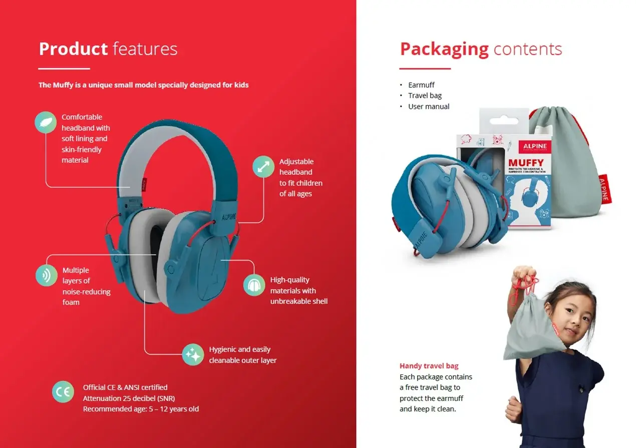 The Alpine Muffy has been especially designed for the ears of small children and can be used in various noisy situations, such as parties, practice rooms, firework displays, car and motor races and concerts.