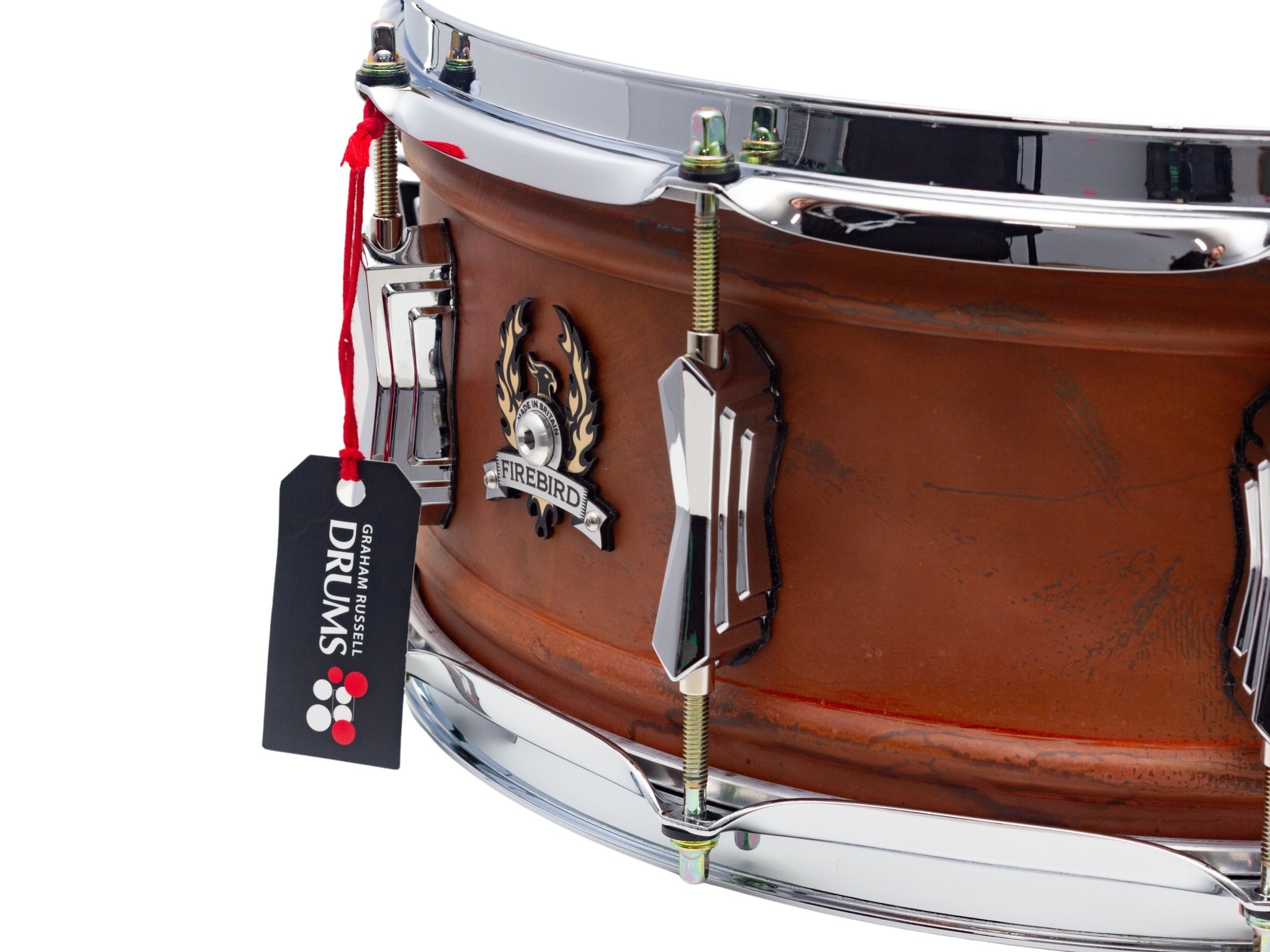 Each copper over brass Firebird shell undergoes the meticulous hand torching process, resulting in mesmerising scorch marks—truly unique to every drum.