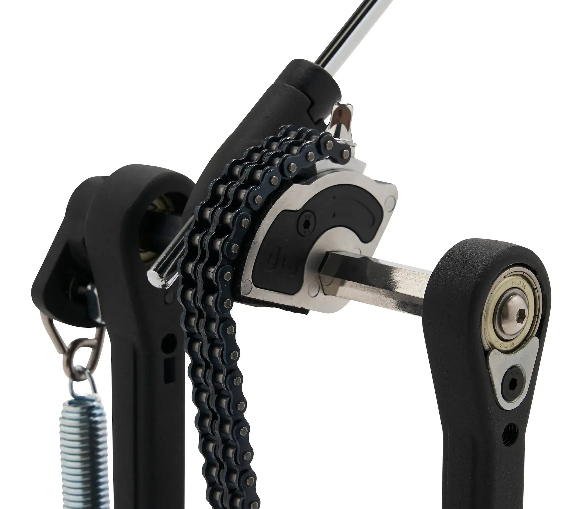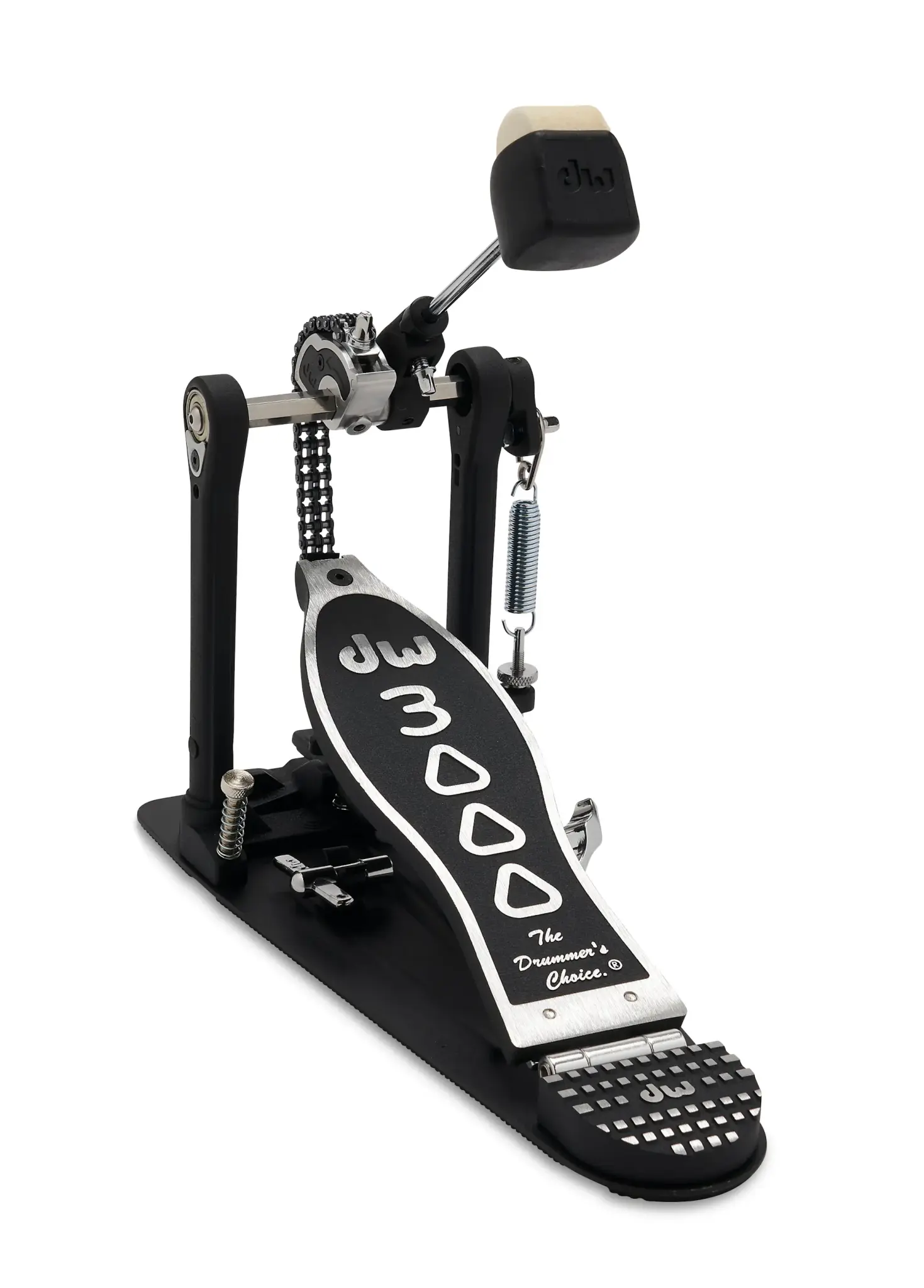 The 3000 Series pedal offers innovative features and enhanced player functionality making it a smart, versatile choice for drummers of all skill levels and playing styles. Enjoy more features in the 3000 Series pedal than ever before. This all-metal, dual-chain single pedal has been updated with an Accelerator' cam, adjustable footboard angle, and swivel toe clamp. The steel base plate also now features an anti-skid rubber mat for greater stability.