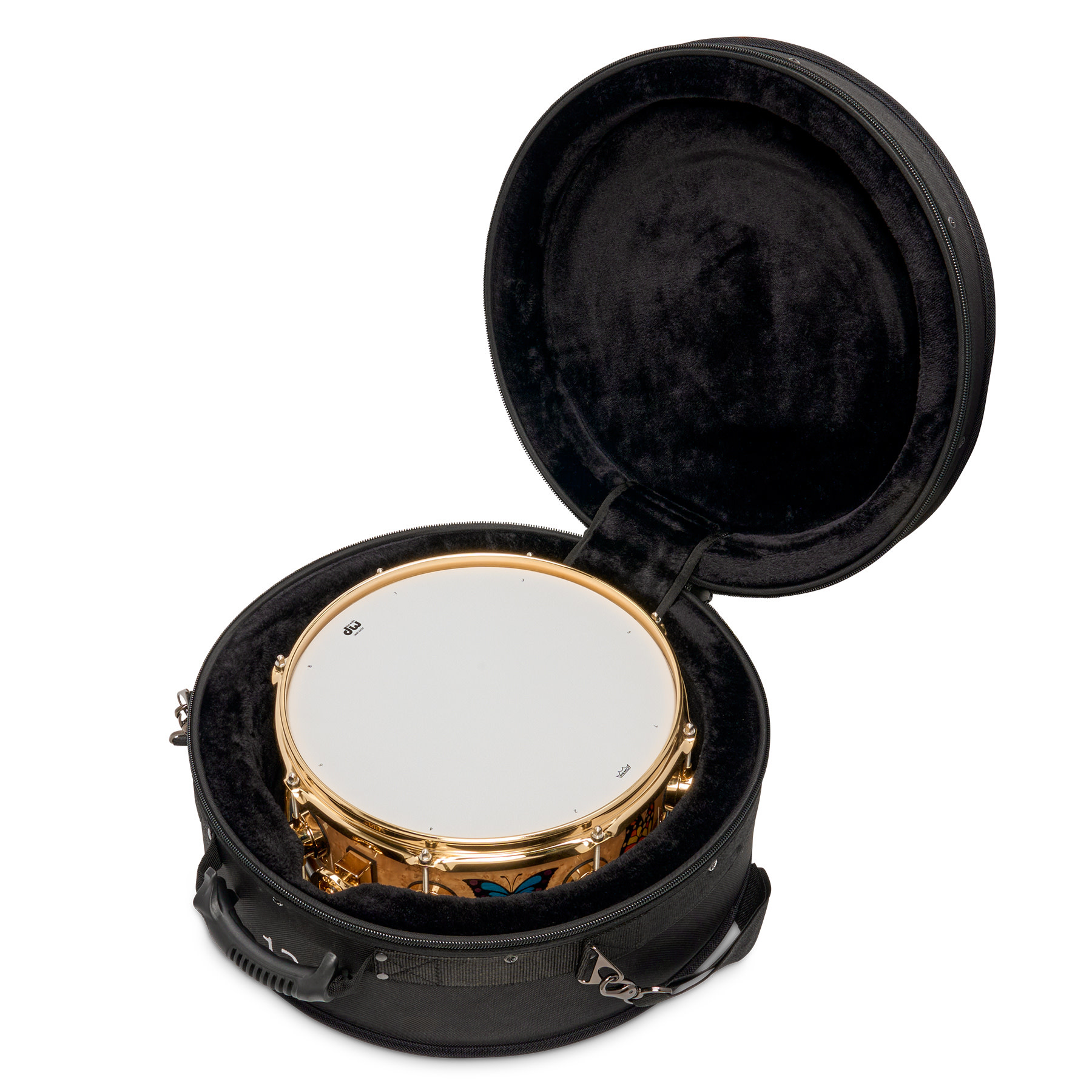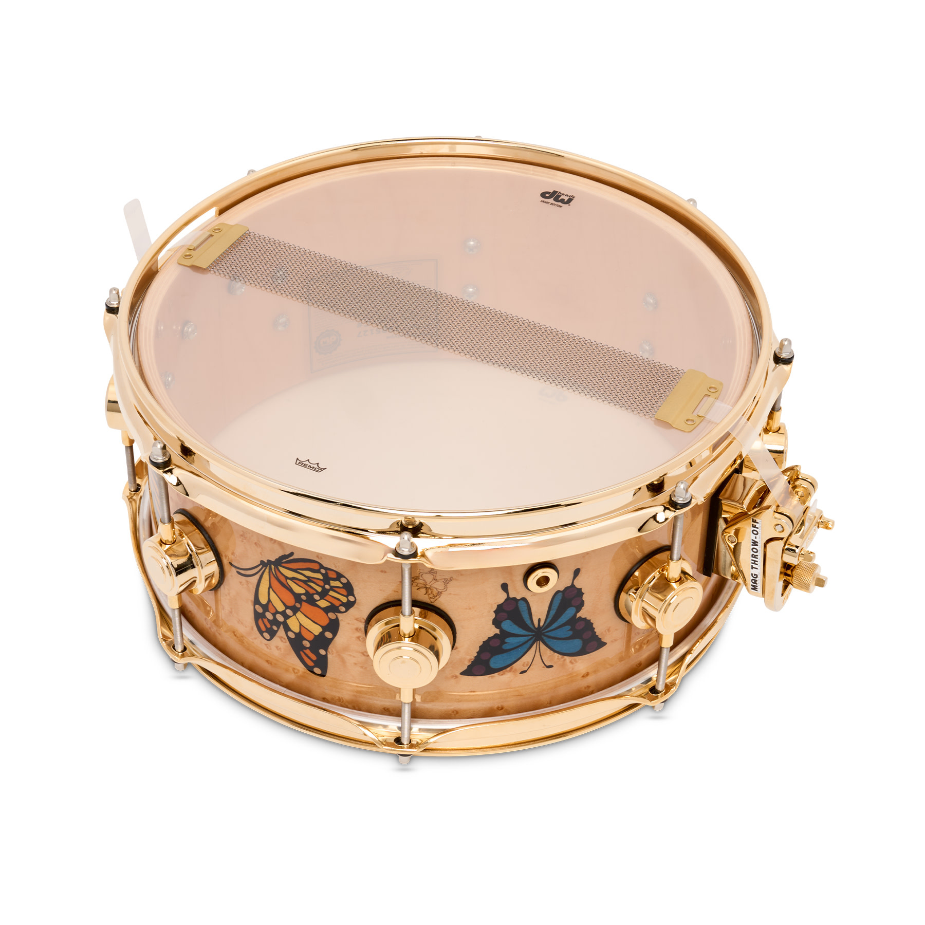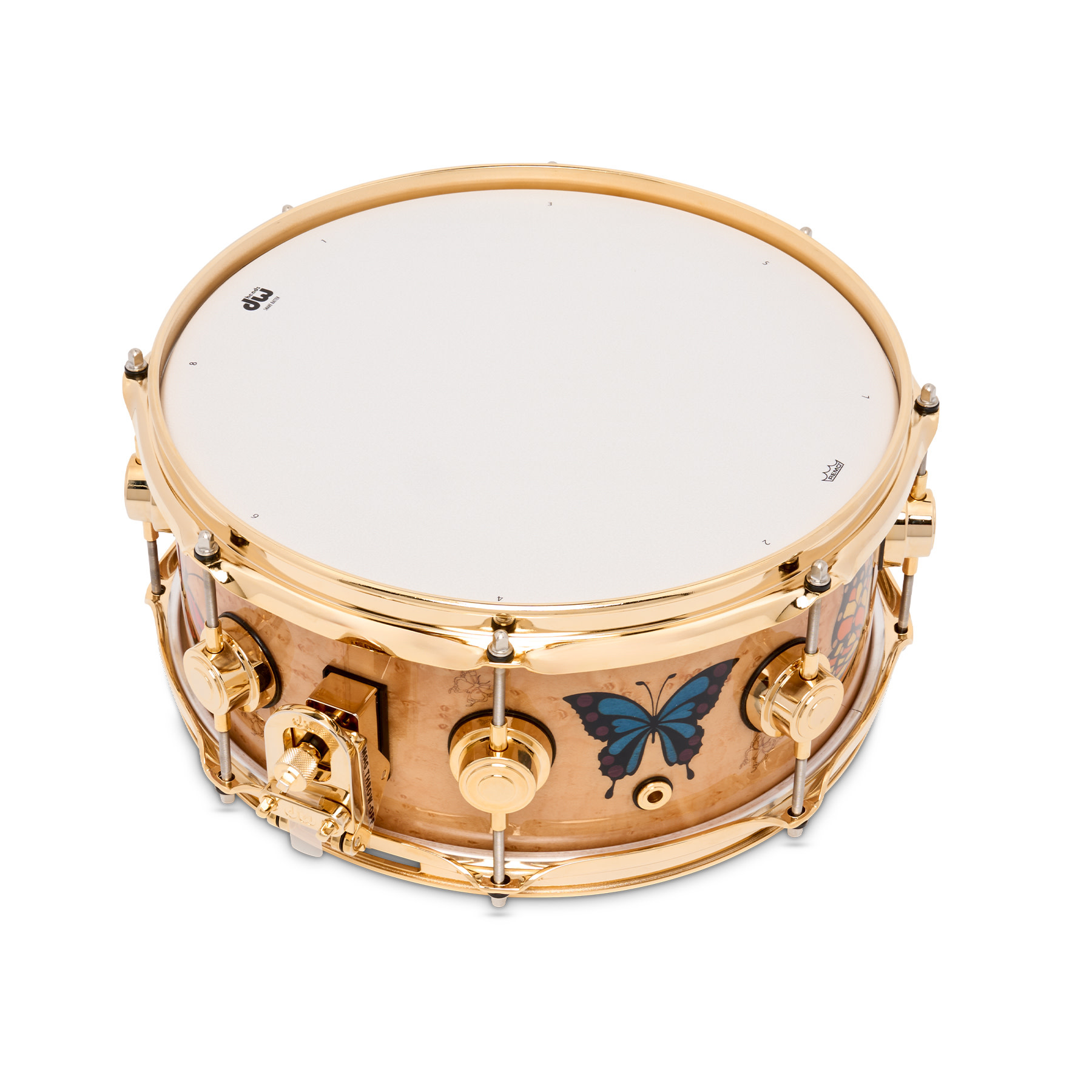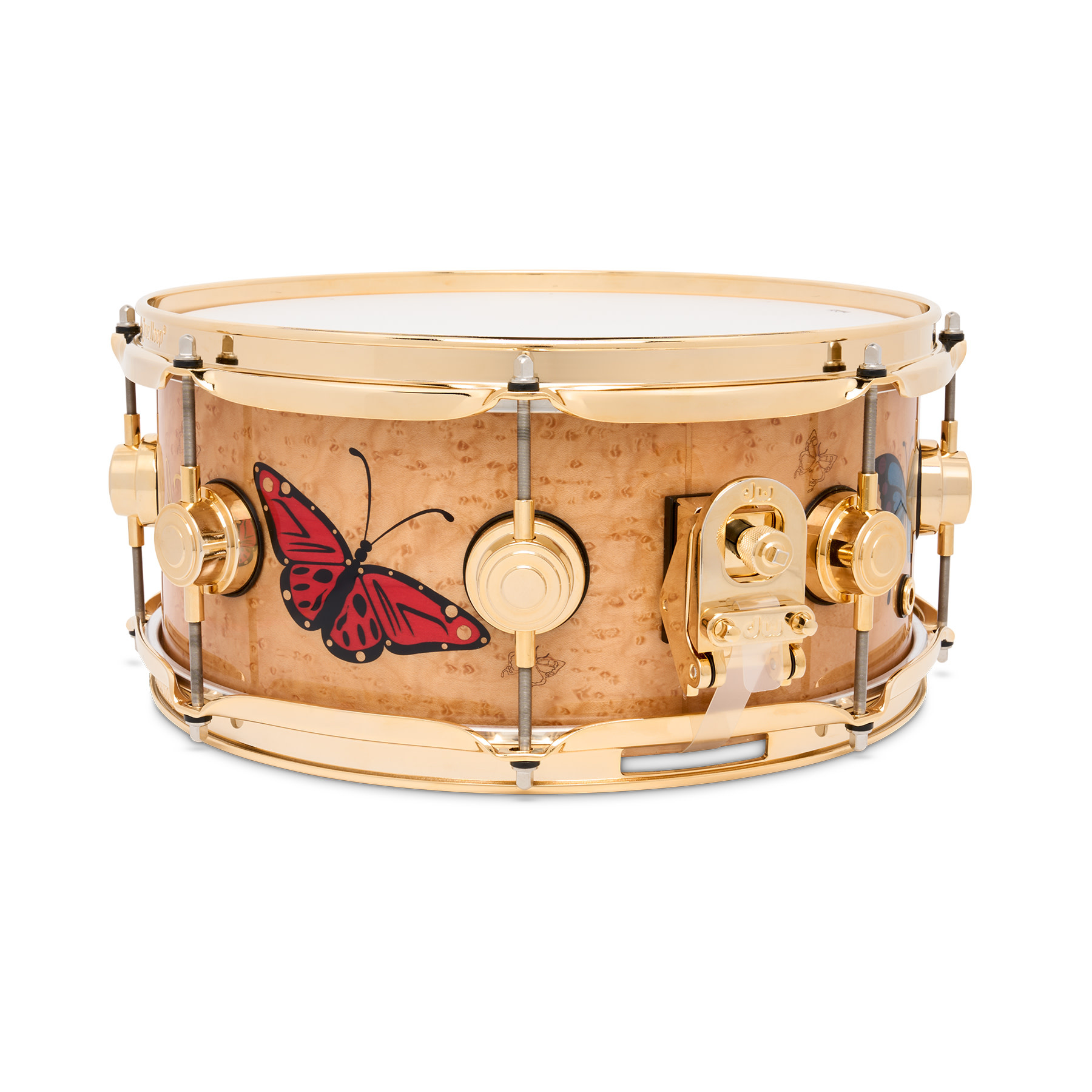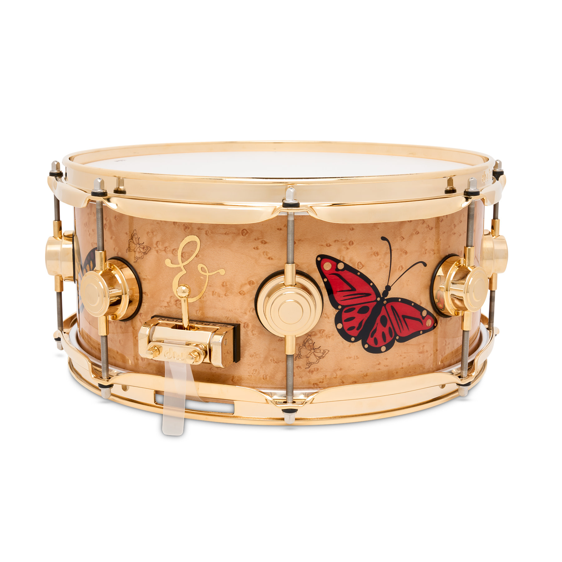 Sheila's Icon 13" snare is built with a handcrafted 12-ply North American Hard Rock Maple shell featuring HVLT grain orientation, which is enveloped in a veneer of hand-selected birdseye Maple. The striking exterior is fitted with gold inlays of Sheila's signature backwards "E." along with a kaleidoscope of laser-cut and dyed butterflies crafted from Basswood (blue, red, and purple), Pearwood (black), and Poplar (orange). These ornate multi-coloured butterflies pay tribute to a personal symbol of Sheila's musical journey.