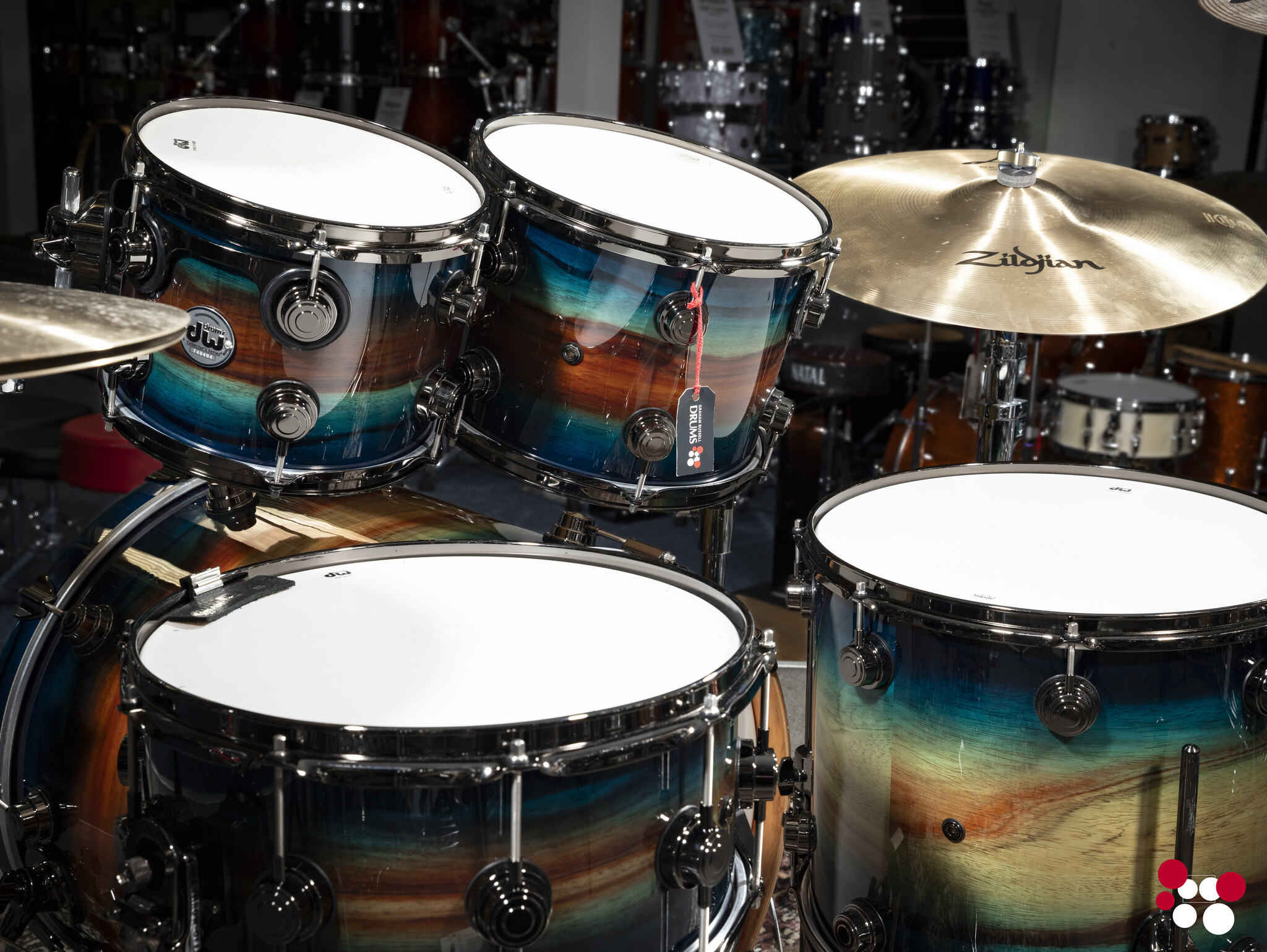 This DW Collectors Sonic Ply 22" Drum Kit, Natural to Quick Royal Blue Burst Lacquer Over Horizontal Padauk, w/Black Nickel Hardware is now available with us at Graham Russell Drums.