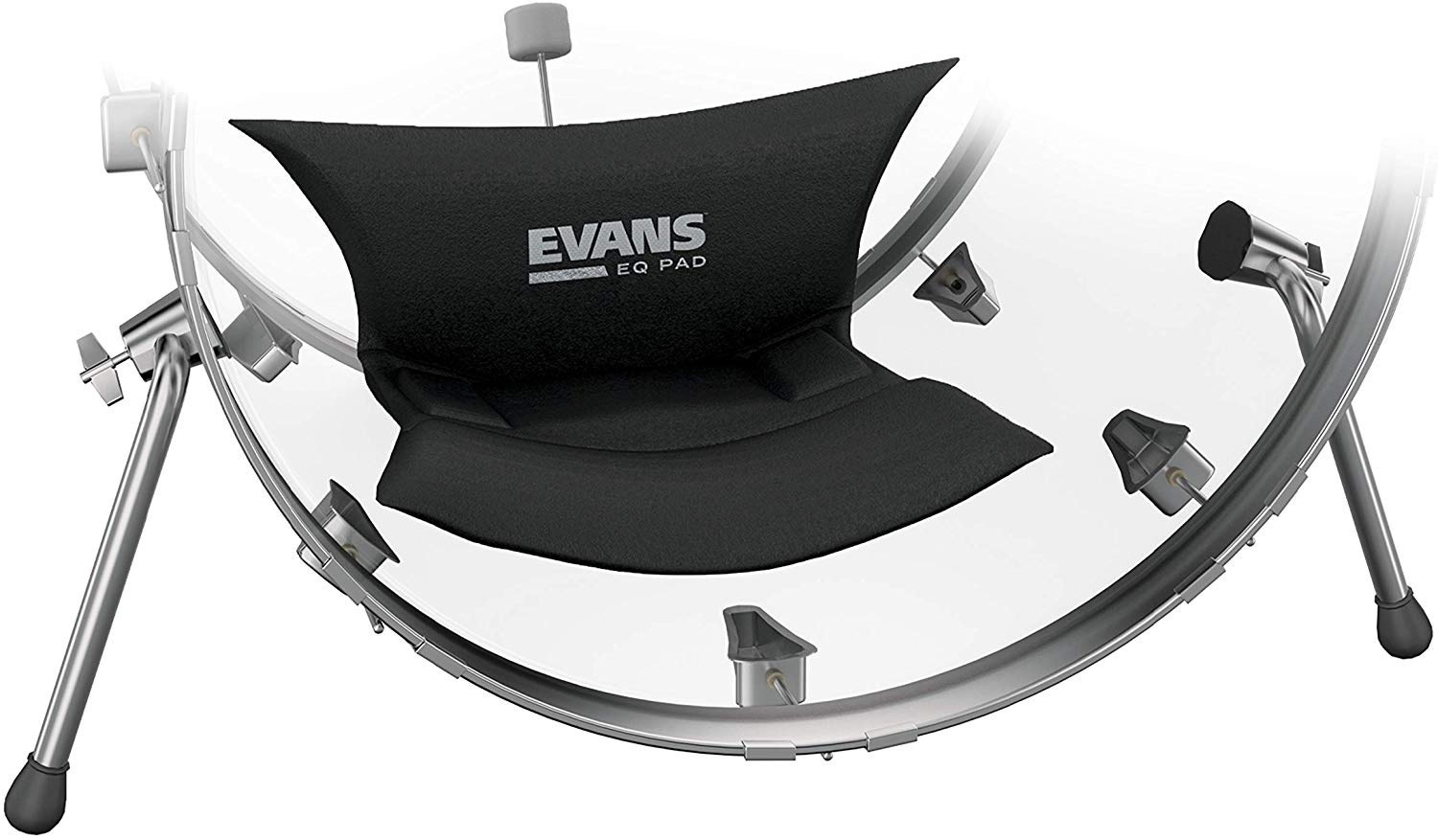 Evans EQ pad is a highly efficient bass drum muffler that attaches to the bottom of the bass drum shell with Velcro. The hinged pad bounces off the head, allowing sustain, before returning to damp the vibrating head. A smaller pad on the opposite end can be used on smaller drums or for minimal damping.