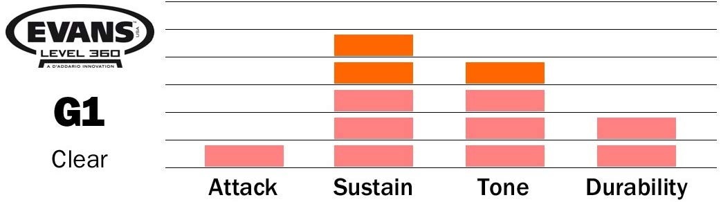 Evans G1 series features a single ply of 10mil film blending a bright tone, sustain and sensitivity. It sets the standard for an open and expressive sound. Tuned low, it produces a cavernous rumble that emphasizes the natural sound of the shell. The coated version delivers additional warmth, focus, and depth.