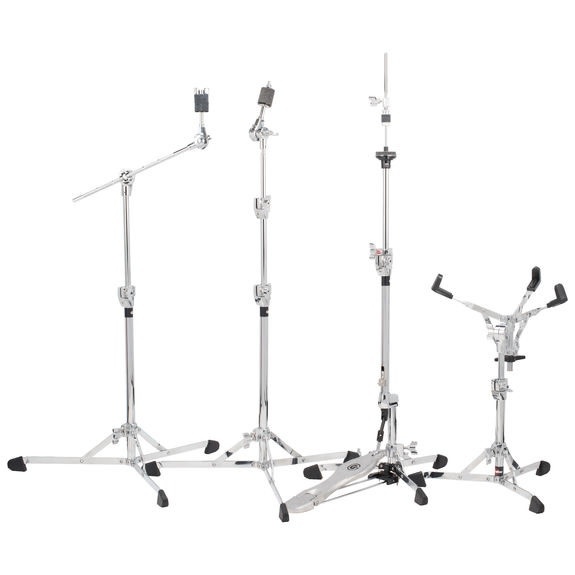 The Gibraltar 8700 Series Hardware Pack offers modern hardware conveniences with a throwback flat base design. This setup includes a telescoping snare stand, a boom stand equipped with a capable cymbal tilter and a straight cymbal stand. A hi-hat stand with memory locks, tilting screw and branded foot pedal rounds out the pack. This lightweight hardware is ideal for a jazz drummer or early set player looking to upgrade or outfit in a single purchase.