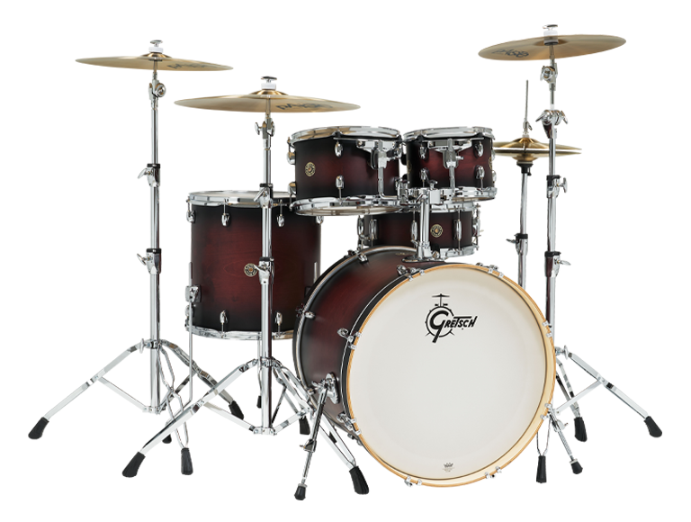 The 7-ply Gretsch-formula maple shell has 30-degree bearing edges and natural shell interiors. Bass drums include telescopic bass drum spurs and matching maple wood bass drum hoops. Toms and snare drums feature 2.5mm triple flanged hoops. All drums are fitted with Remo® drum heads.