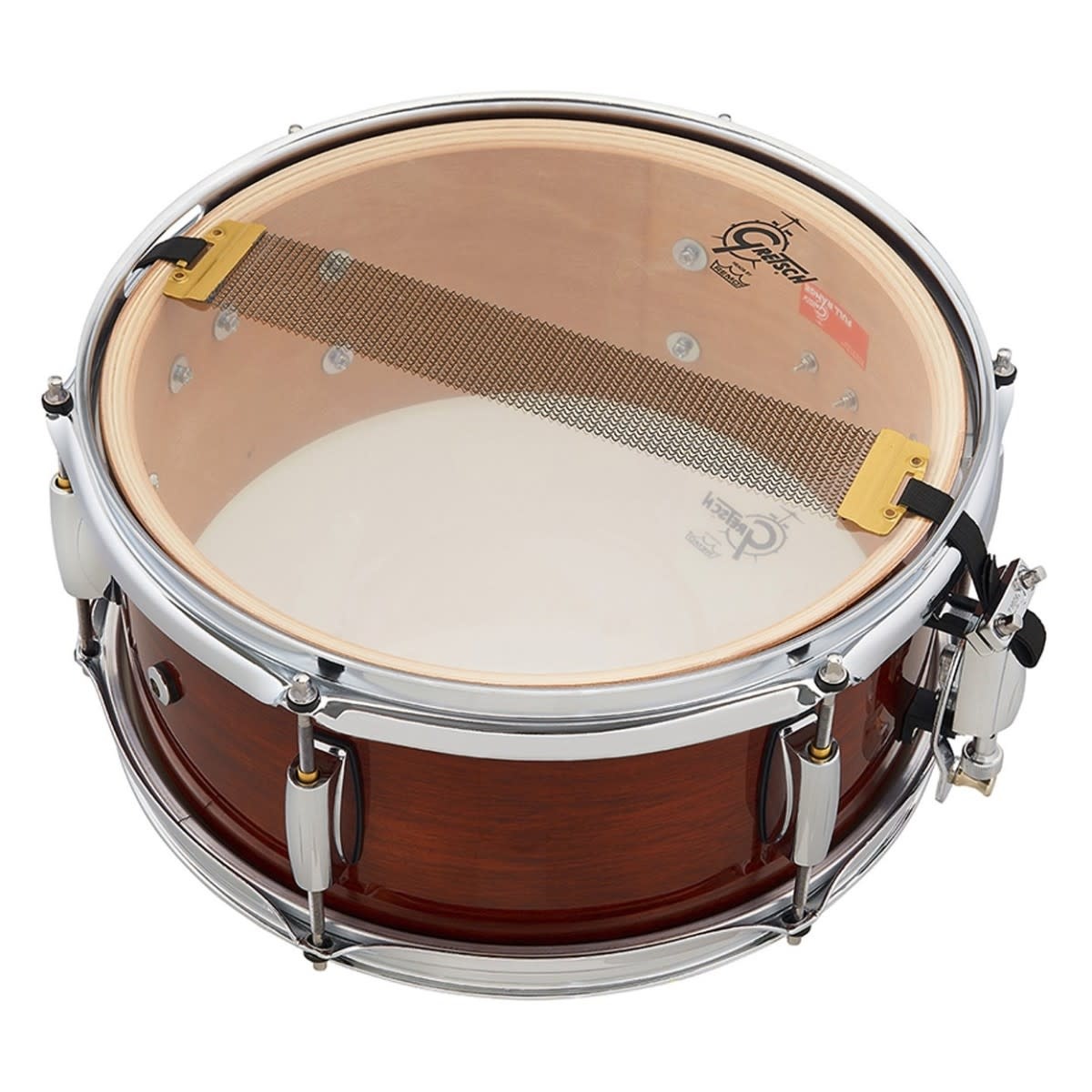 The drum is fitted with Gretsch hardware designed for consistent tuning stability and reliable performance. Gretsch Full Range lugs provide even tension distribution across the shell while maintaining a clean, modern aesthetic. The drum is equipped with Gretsch 302 double-flanged hoops, which combine the openness of traditional triple-flanged hoops with added rigidity for improved tuning consistency. A Gretsch Lightning throw-off provides smooth and dependable snare engagement, paired with a matching butt plate. The drum is finished in a high-gloss lacquer, showcasing the natural wood grain while giving the drum a classic Gretsch appearance.