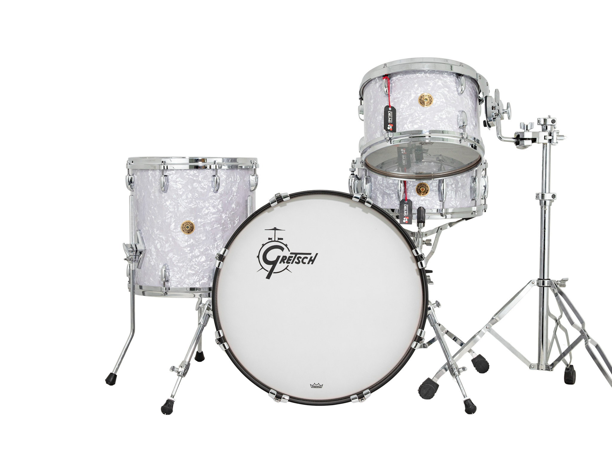 The Gretsch drum set features foiled shells in a striking White Marine Pearl finish, complemented by durable chrome hardware. At the heart of this kit are Gretsch USA shells, handcrafted from 6-ply maple wood, which are renowned for producing the iconic “Great Gretsch Sound.”