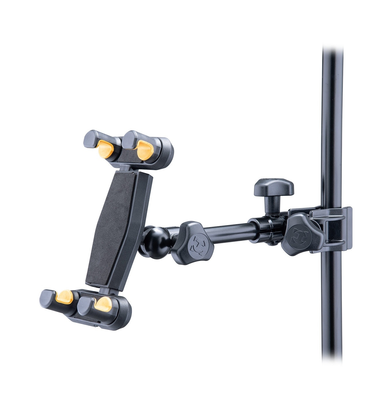 The Hercules DG307B Smartphone and Tablet Holder holds your smartphone and tablet securely and allows you to mount it on a desk, mic stand or music stand. Perfect for on stage, rehearsals, or podcasting, where you need to see your smartphone clearly.