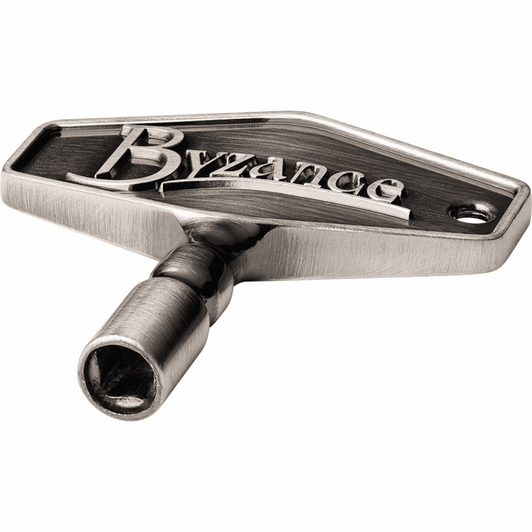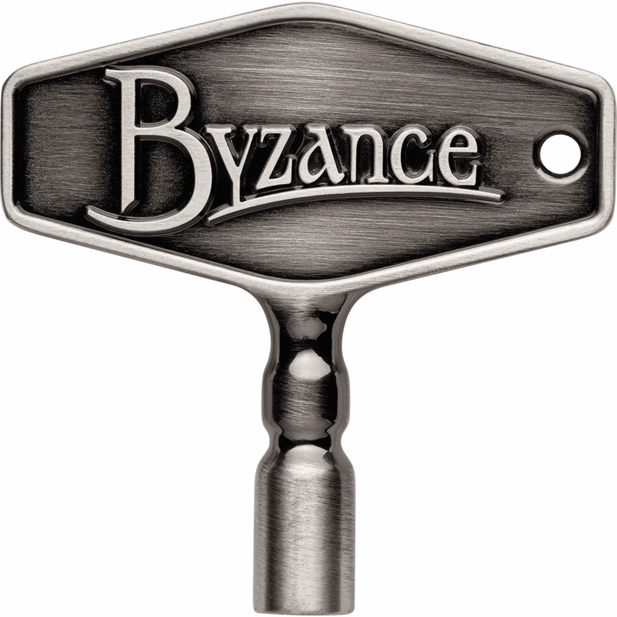 Functional and eye-catching, the look of the Byzance Drum Key by Meinl is symbolic of Byzance cymbals — dark and earthy, yet refined and precise. One side shows off the Byzance logo while the other features the Meinl logo. The antique tin plated finish adds a unique touch to its appearance, along with a contoured shape. Easy to tune with, the wing design is wide enough to make quick adjustments or head changes. A key ring hole allows you to attach the Byzance Drum Key to your everyday set of keys.