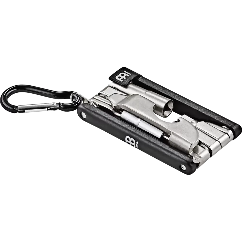 The Meinl Drum Tech Multi-Tool covers the essentials needed by drummers and drum techs: a drum key, flat screwdriver, Phillips screwdriver, socket wrench, hex drivers (2, 2.5, 3, 4, 5mm), and a bottle opener. It attaches to any bag or case with the carabiner hook.
