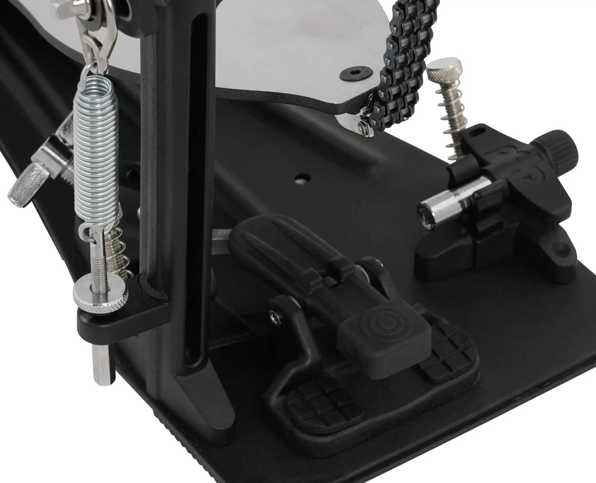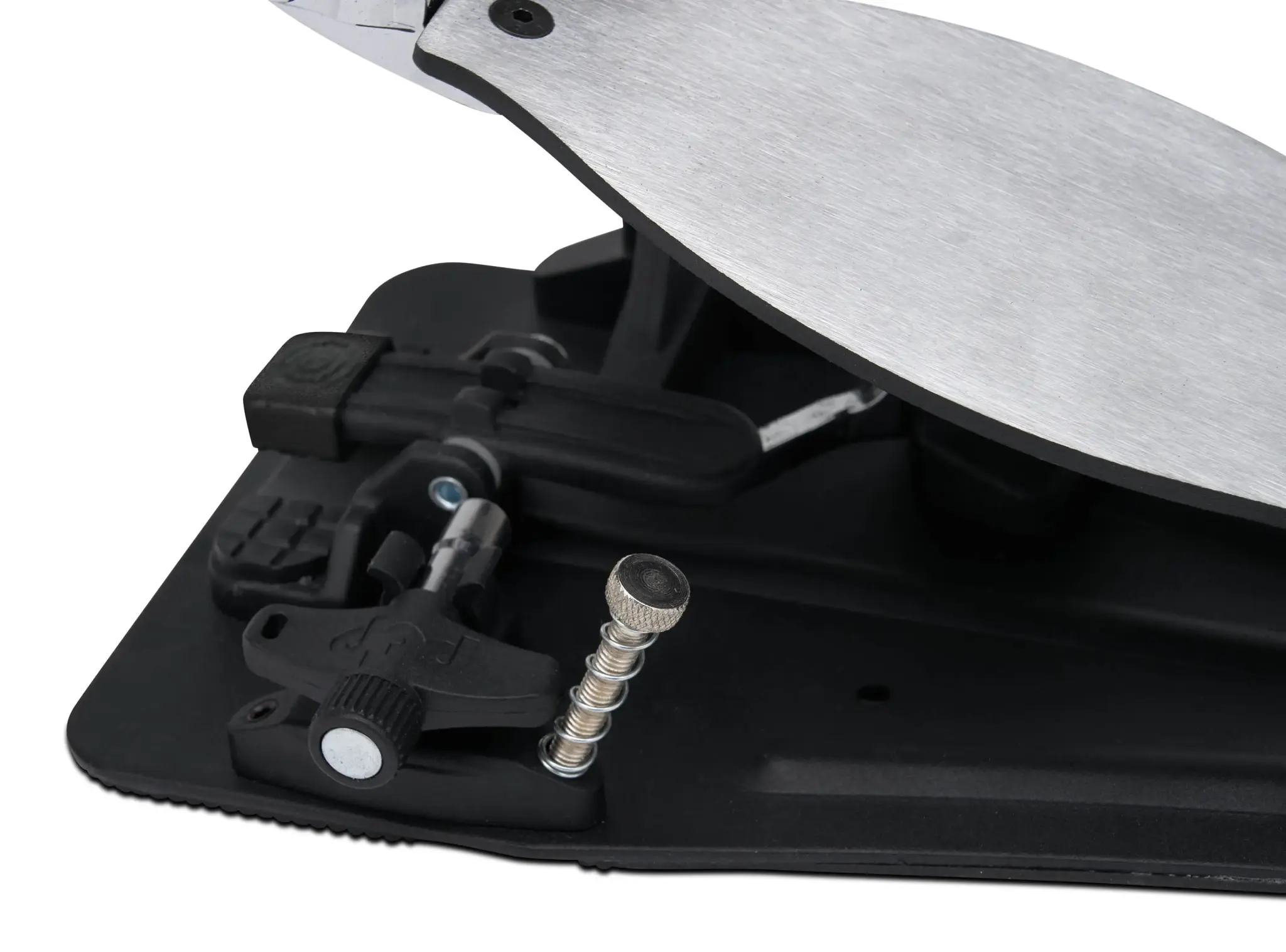 Designed in California by DW for optimal playability, the Concept Series Double Pedal is a boutique-inspired machine that's quick and responsive. The pedal's design is outfitted with a dual-chain concentric drive system, smooth cast extended footboard with integrated needle bearing hinge, single post auxiliary pedal, telescoping linkage with universal joints, and an offset toe clamp.