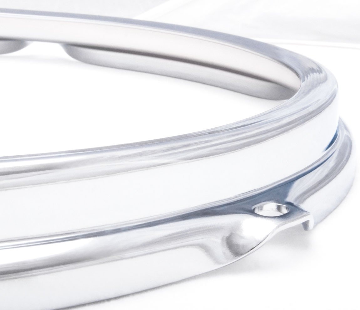 These are triple flanged hoops - with a twist. Instead of the top edge of the hoop turning outwards like standard hoops, S-Hoops turn inwards towards the drum head. This allegedly makes the hoop more rigid and creates the effect of a die cast hoop, but without the added stress.