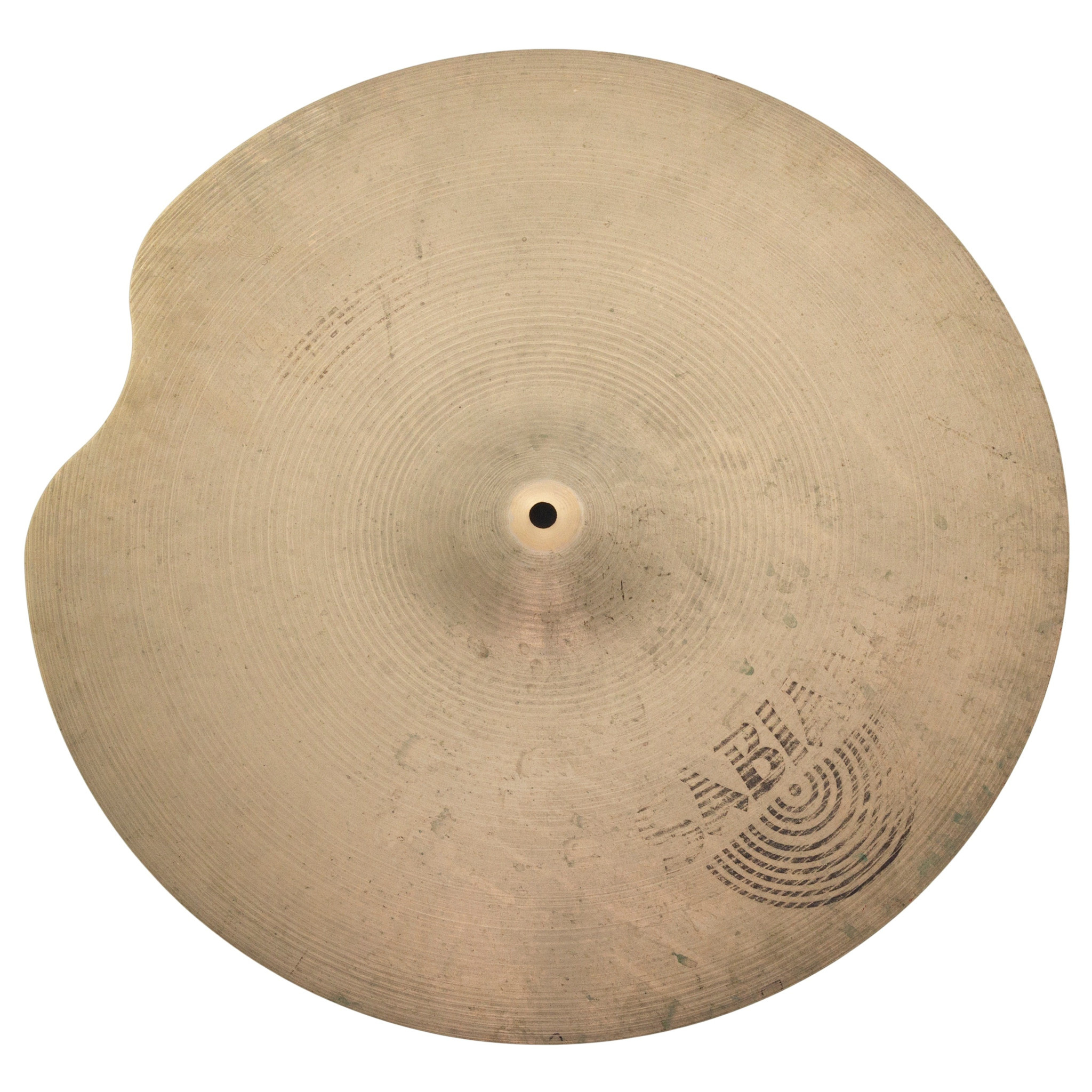 - Condition: 6 / 10 - With a large edge repair made, also with heavy discolouration/dulling, stick/finger marks and scratches but remains very usable and still sounds like a ride cymbal. Ideal for someone on a budget or new to drums.