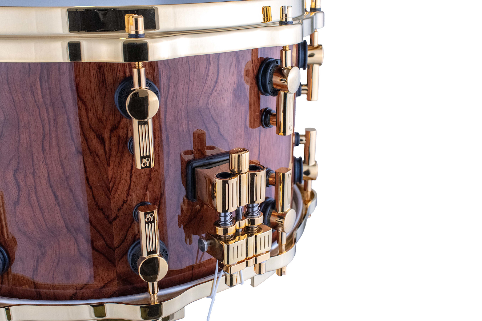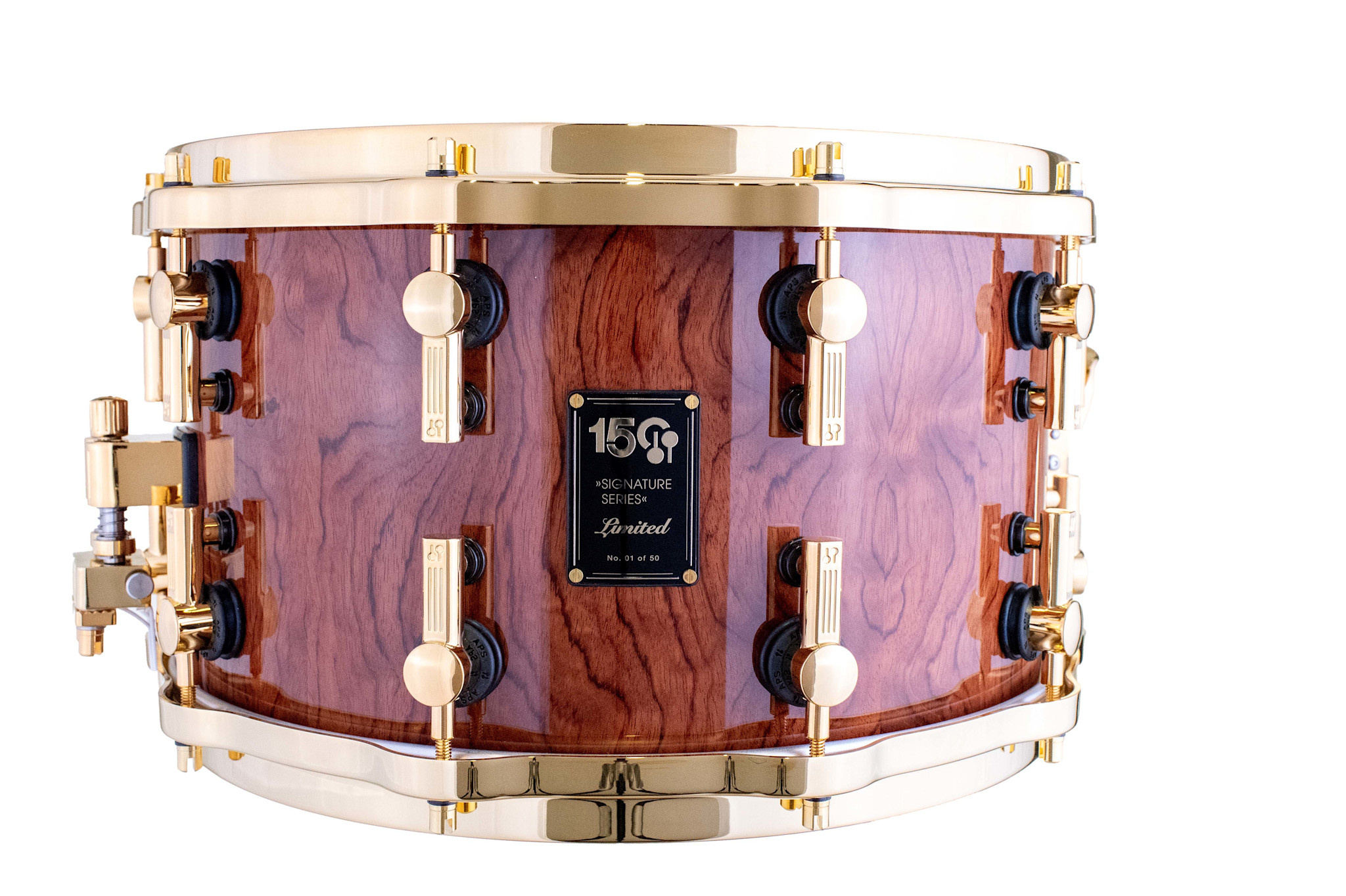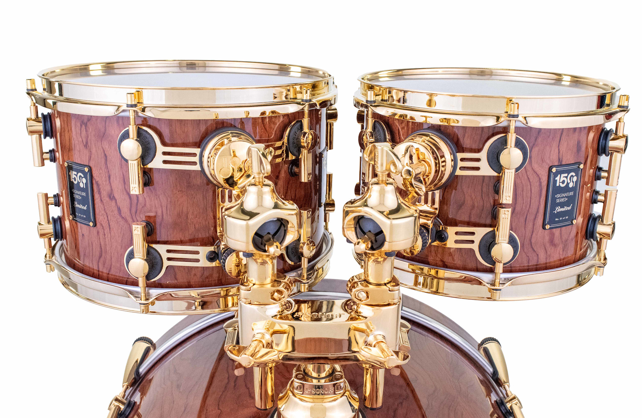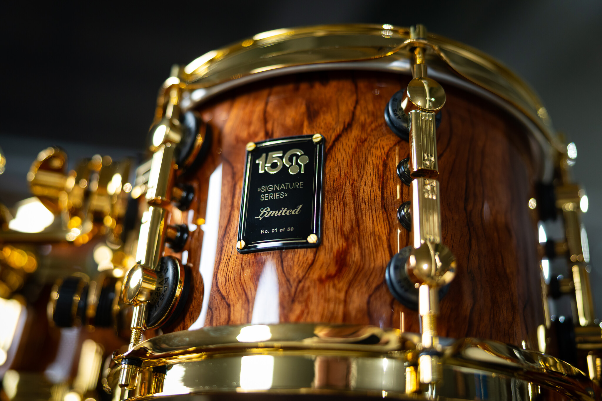 To emphasise the naturally grown beauty of the Bubinga veneer, the shells are finished with clear high gloss lacquer, which is applied in multiple lacquering and polishing stages by hand. All hardware on the drums is plated with 24-carat gold to offset the dark and saturated brown color of the veneer as well as create the ultimate luxurious experience. Finally, all drums receive individually numbered commemorative badges to certify the uniqueness of each 150th Anniversary Signature Series Shell Set.