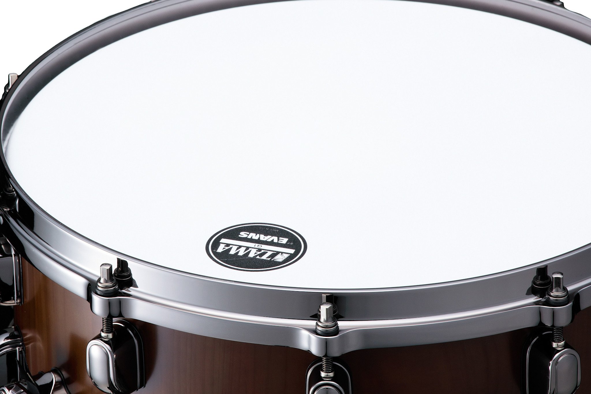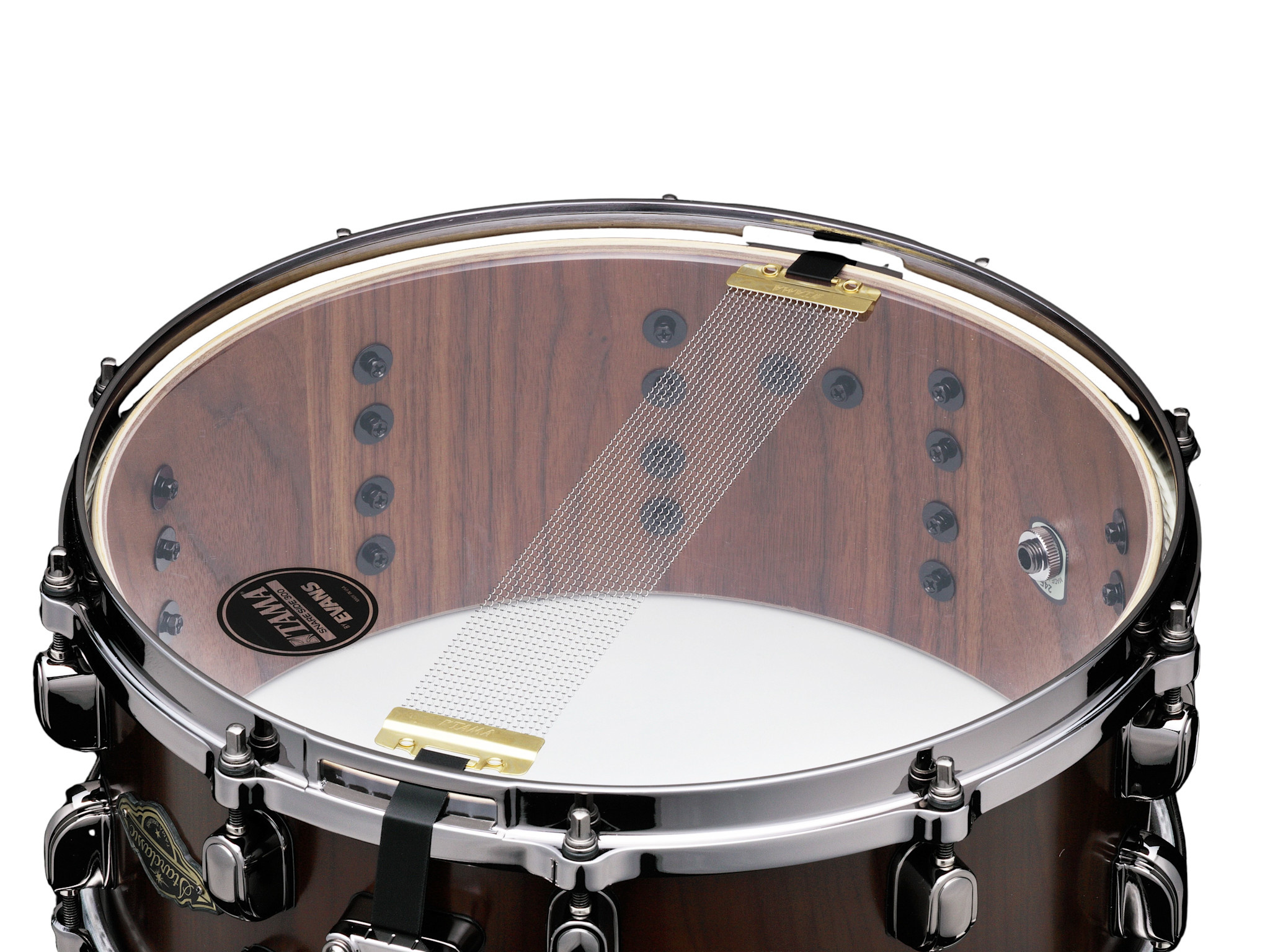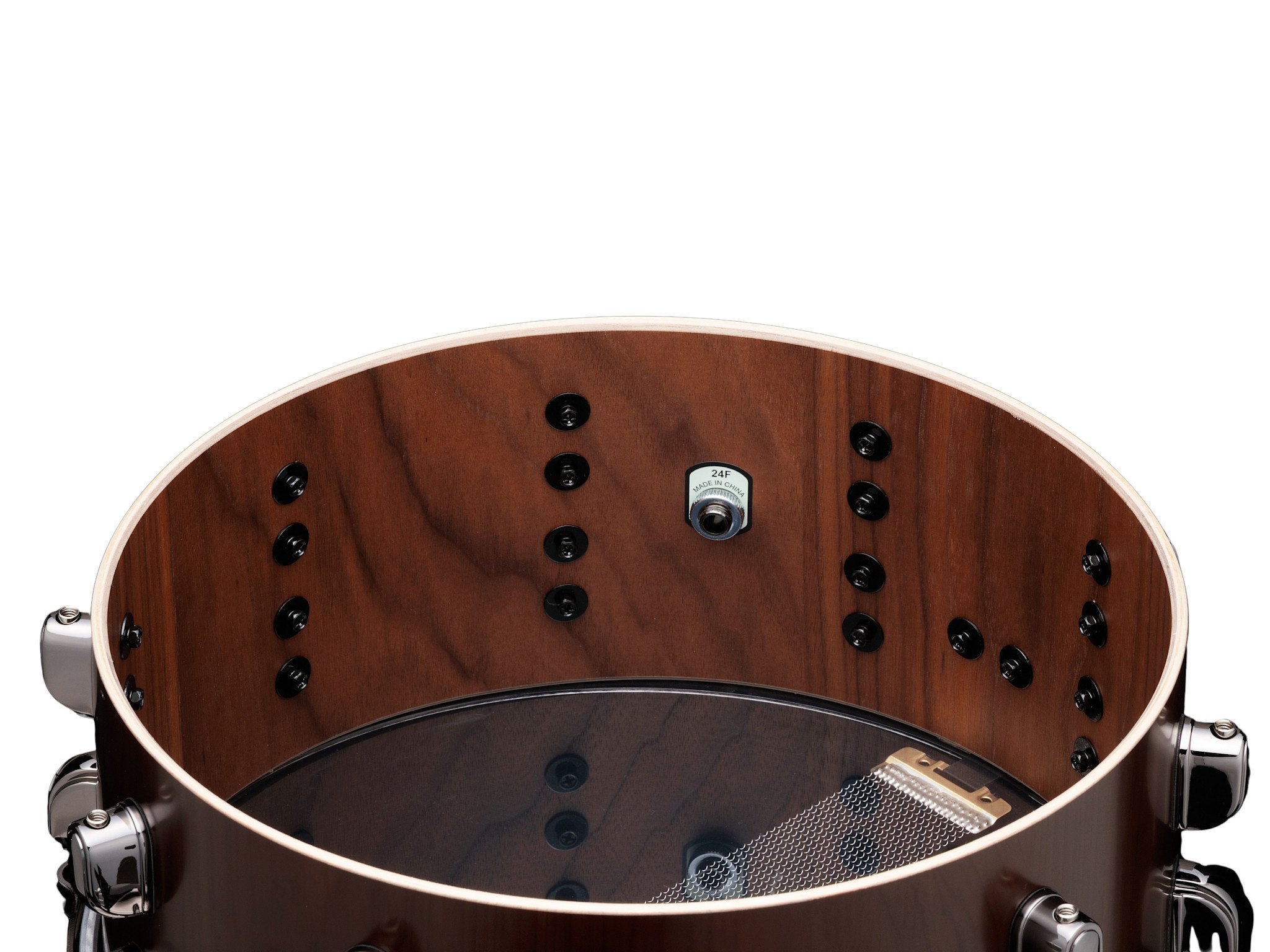 The snare drum features a 6mm shell constructed from four plies of European Birch, two inner plies of American Black Walnut, and one outer ply of Cedar. This premium hybrid shell delivers a balanced tonal character with warmth, clarity, and focused projection.