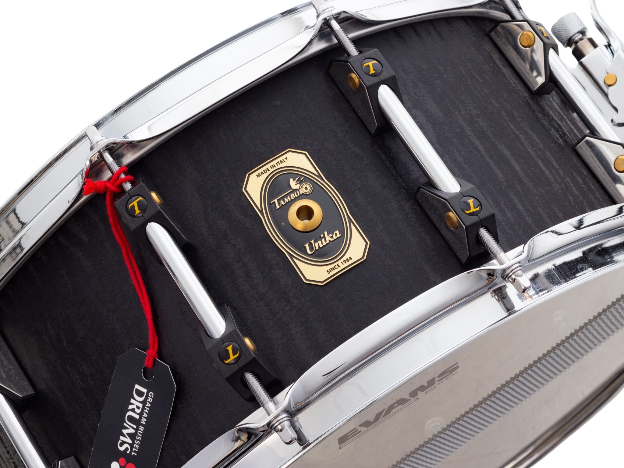Buy a Tamburo Unika 14" x 6.5" Snare Drum in Flamed Black from Graham Russell Drums and receive next day delivery when you order before 2pm.