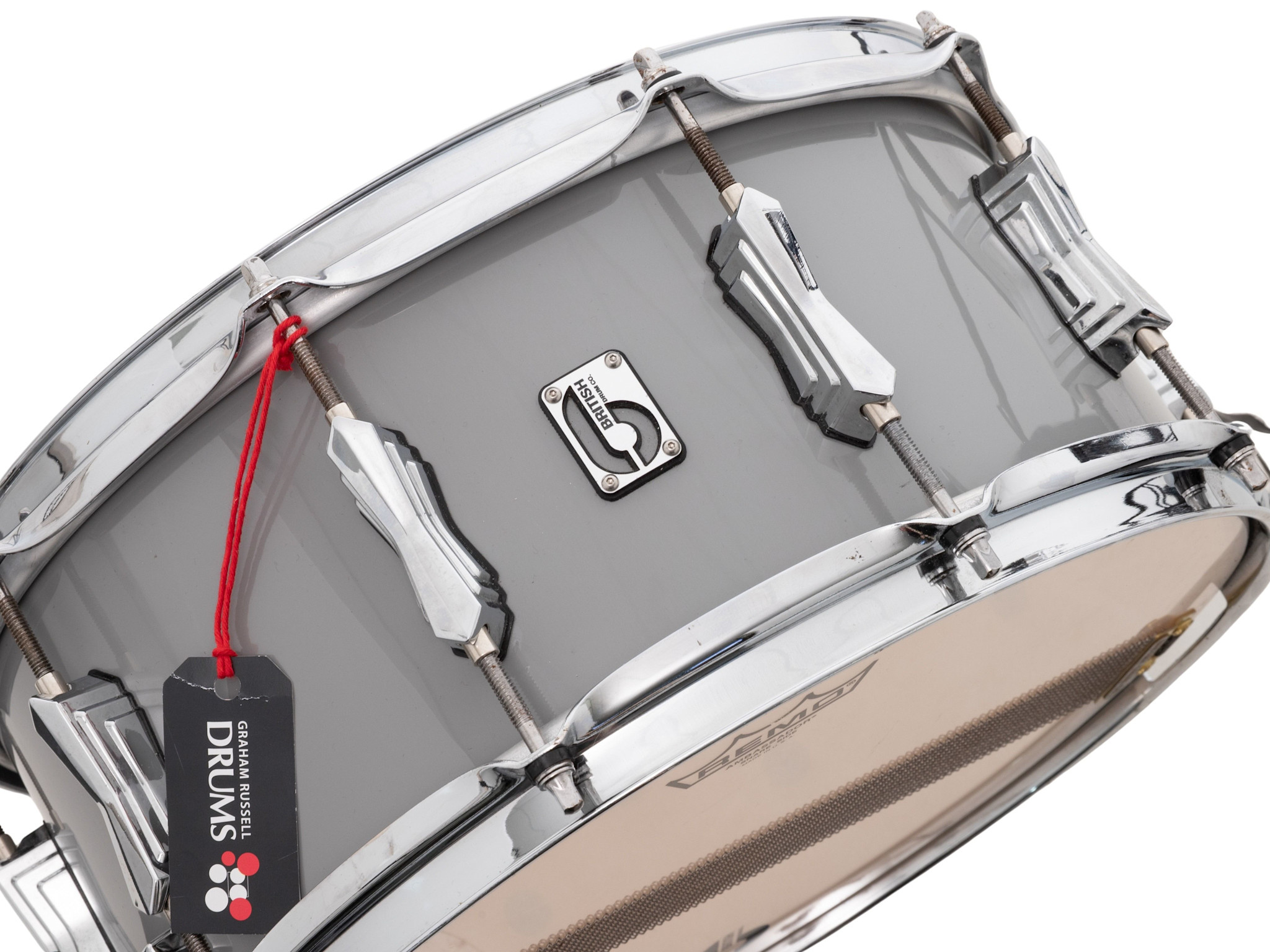 This British Drum Co. Legend Series 14" x 6.5" Snare Drum, Winchester Grey is now available with us at Graham Russell Drums.