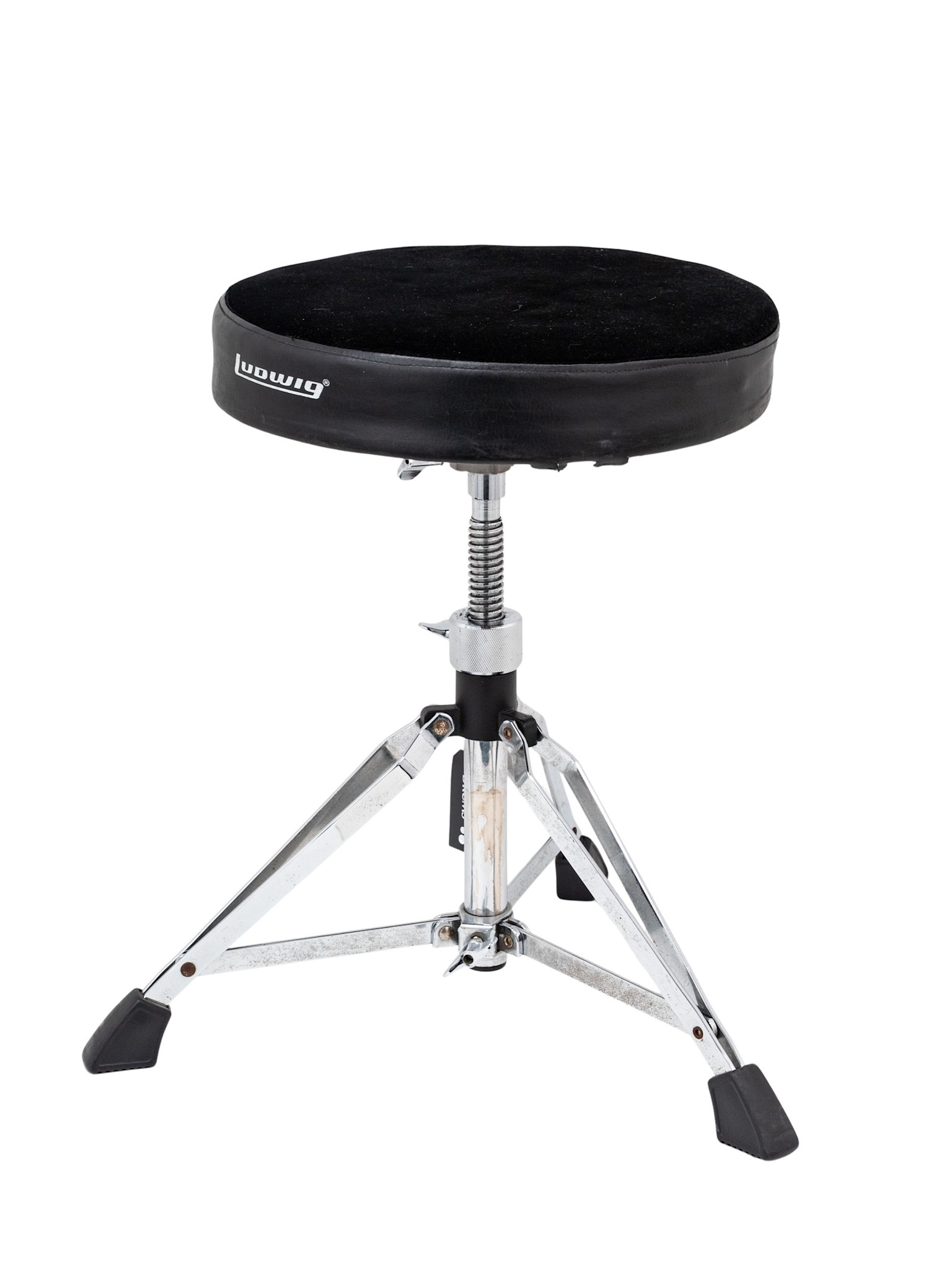 Used condition Ludwig L348TH Round Cloth-Top Drum Stool with cosmetic marks and scratches as well as some notable pitting and rust in places present but otherwise in reasonable condition and in full working order.