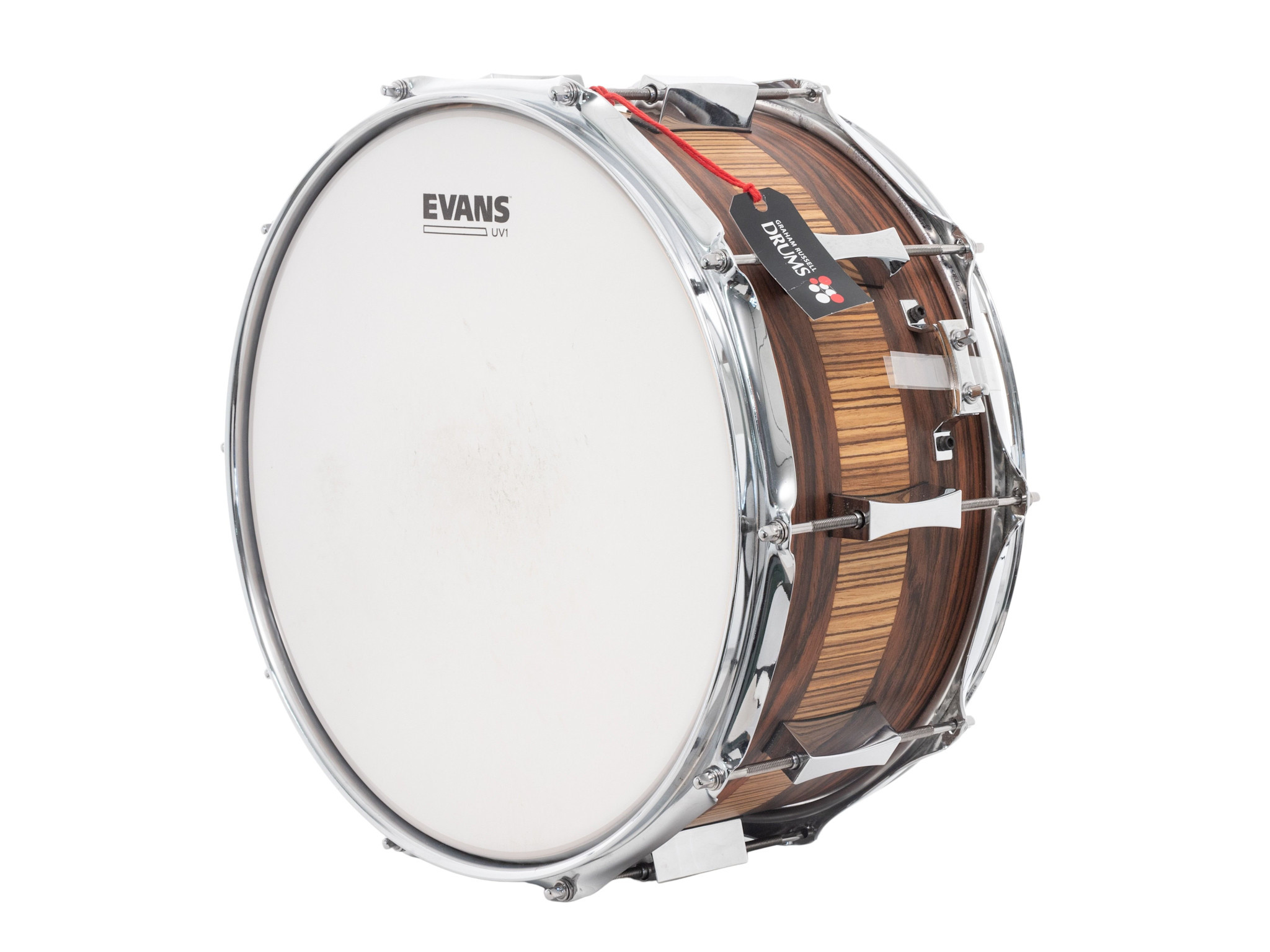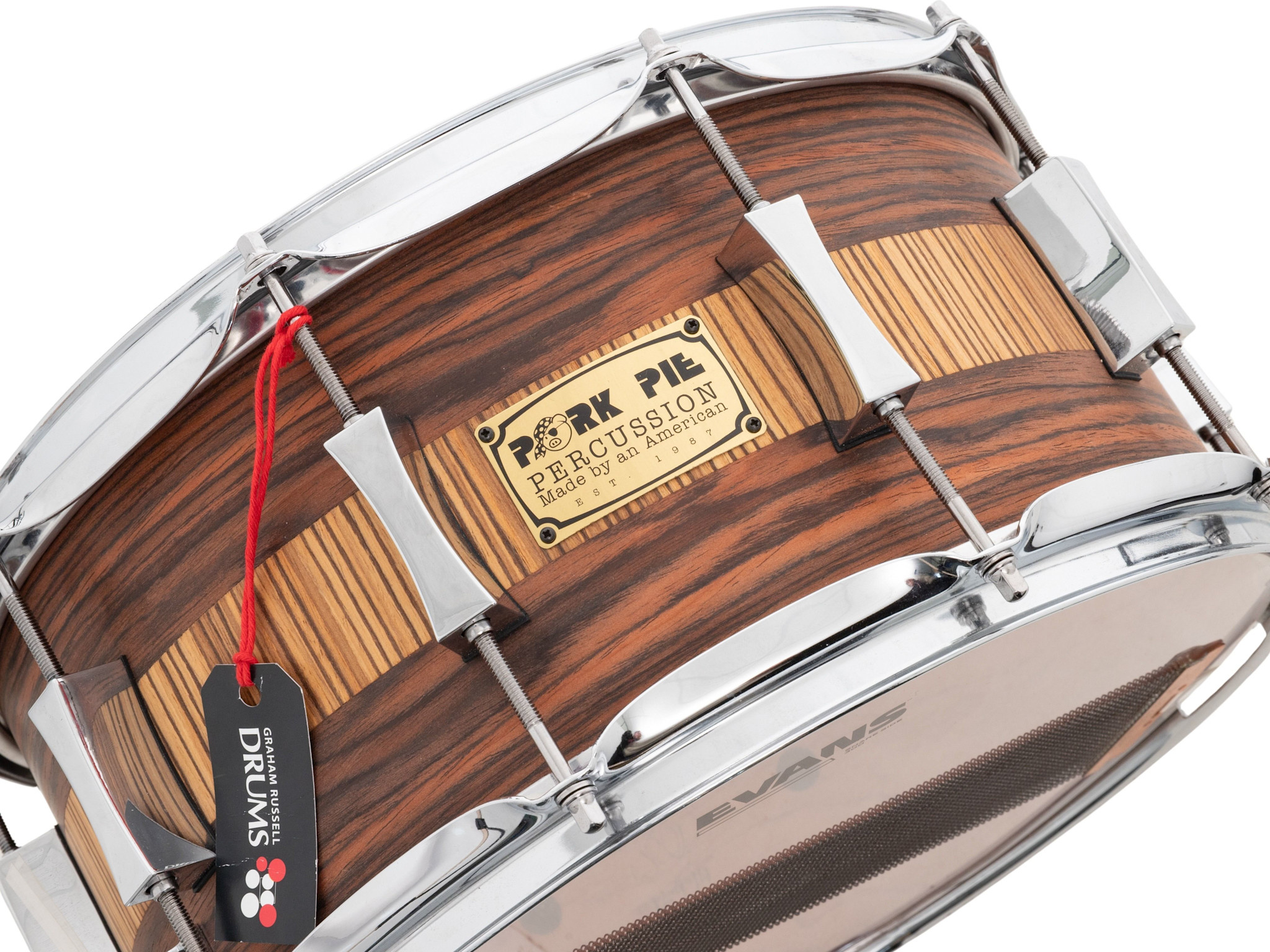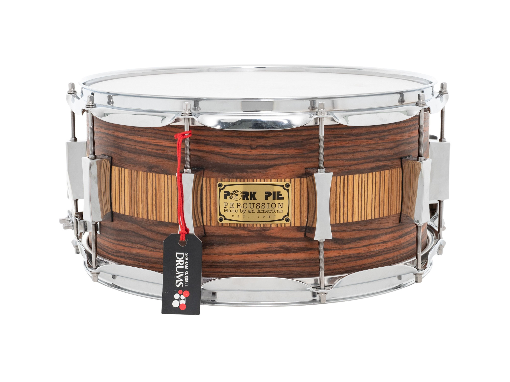 This Pork Pie Percussion 14" x 7" Cherry Bubinga Snare Drum, Rosewood Zebrawood is now available with us at Graham Russell Drums.