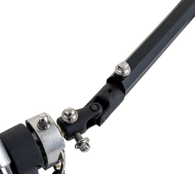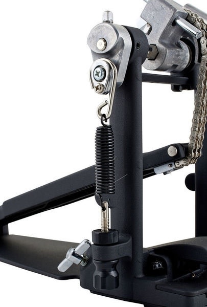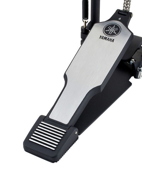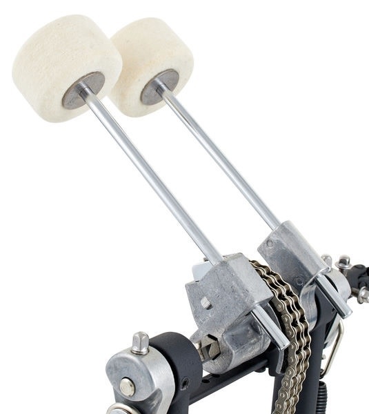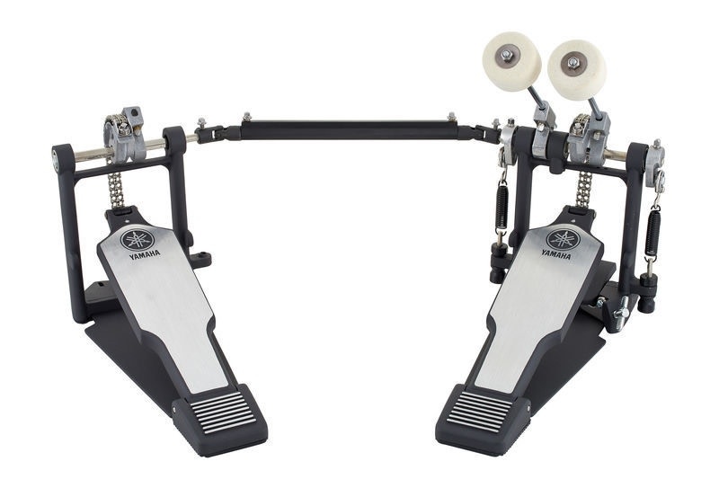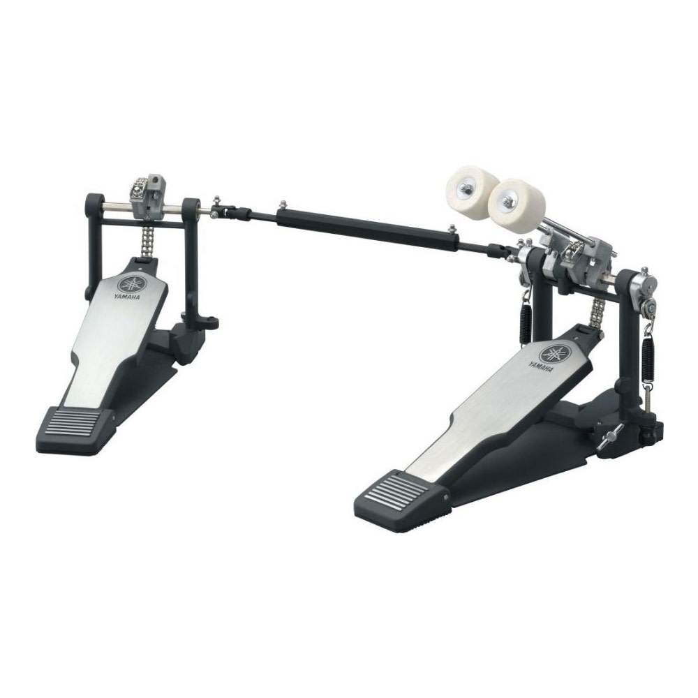The Yamaha DFP-8500C Double Bass Drum Pedal includes a double chain drive systems that makes for one of the smoothest pedals out there. The DFP8500C has adjustments for beater angle, spring tension, and footboard angle. To eliminate flex, keep the bearings in alignment, and give the pedal a smooth feel the Yamaha DFP-8500C's frame has stabilizer bars cast into them below the rocker shafts . Featuring longer and wider footboards, this is a great pedal if you use a heel/toe technique. Teardrop-shaped holes in the beater hubs securely hold the included hard felt beaters. The side-adjustable hoop clamp holds firmly to your kick drum hoop, and tightens with a wing bolt.