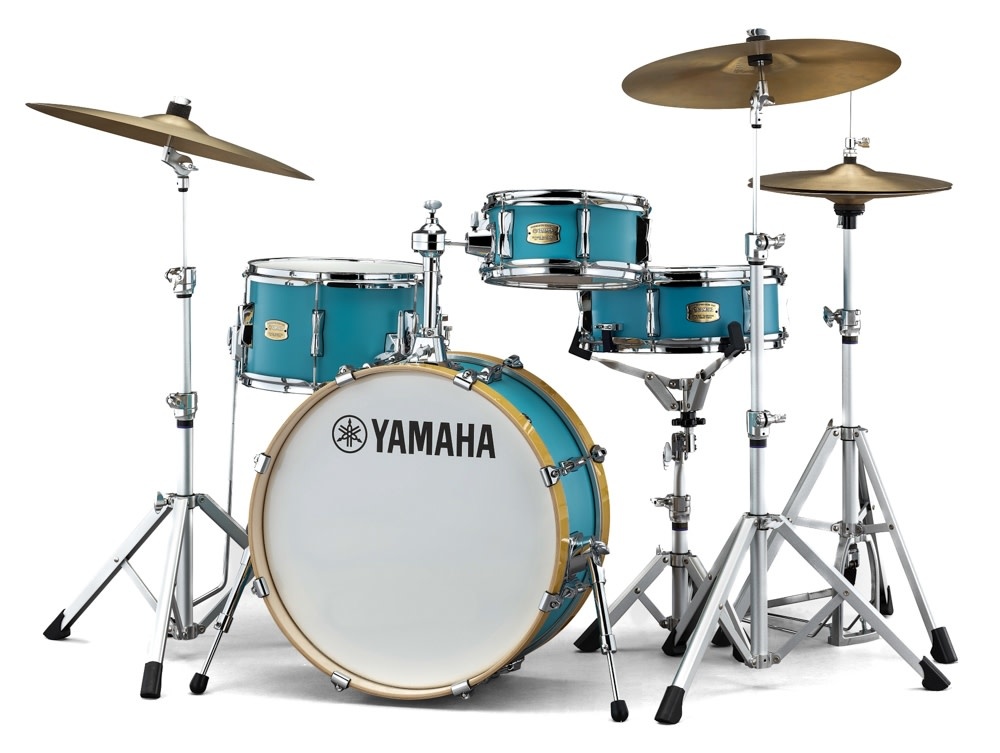 Yamaha Stage Custom Hip Drum Kit in Matte Surf Green features a 20“ x 8“ Bass Drum, 13“x 8“ Floor Tom with Snare, 10“ x 5” Tom and a 13” x 5” Snare Drum. A CL940LB Tom holder is added to the shell pack. The set is offered in four different colours; Classic White, Raven Black, Natural Wood and Matte Surf Green (NEW).