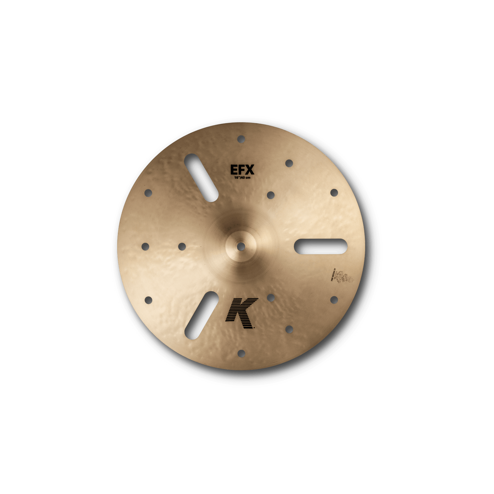 The K EFX is a darker version of the A Custom. This special effect cymbal features a unique laser "cut out" design that creates a dry, trashy sound, with sudden explosiveness and quick decay. Crash it for heavy, punctuating accents, or stack it with other cymbals to explore even more articulations, colors and effects. K EFX cymbals come in a traditional K finish and thin weight.